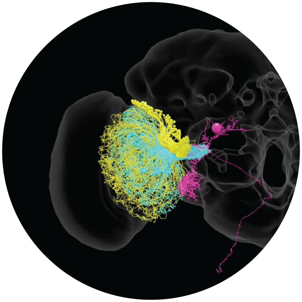 We use a variety of techniques, from in-vivo patch-clamp recordings and calcium imaging in behaving flies over automated behavioral analysis to electron microscopy-based connectomics approaches.